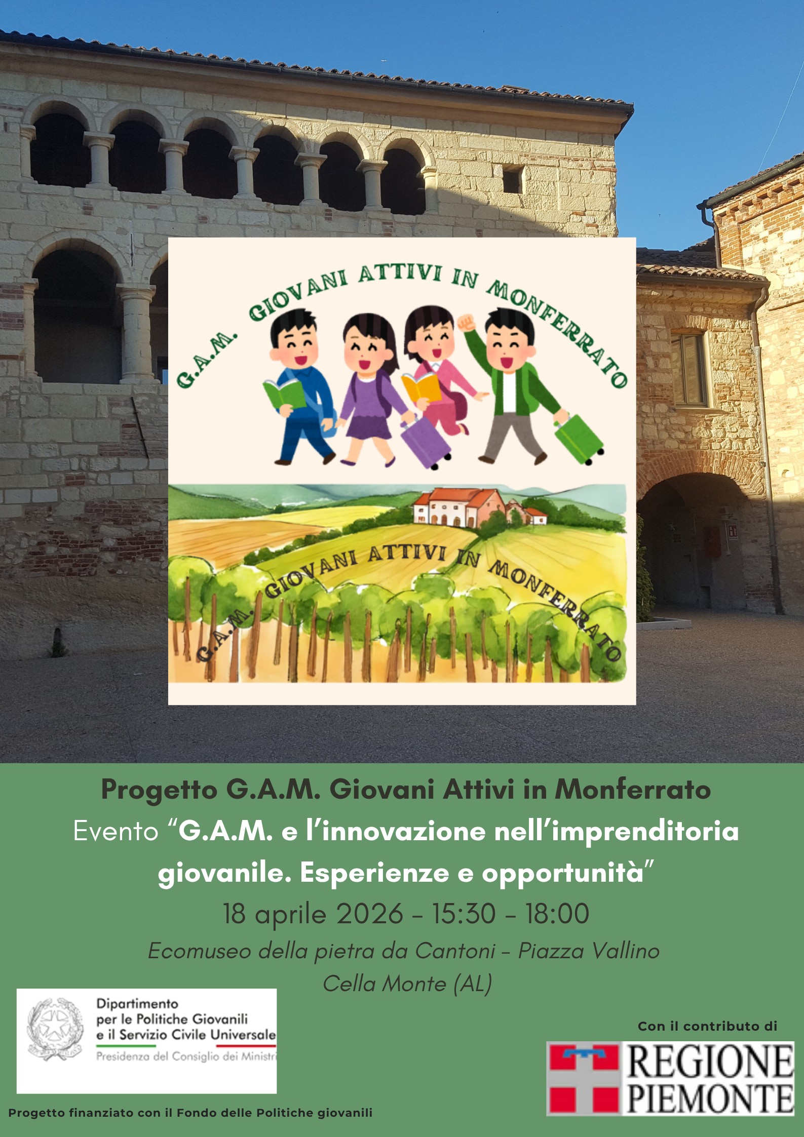 Il Comune di Ozzano Monferrato è ente partner del progetto “G.A.M. – Giovani Attivi in Monferrato”, finanziato dalla Regione Piemonte e realizzato insieme ai Comuni di Rosignano Monferrato, Cella Monte, Terruggia, San Giorgio Monferrato e Treville.